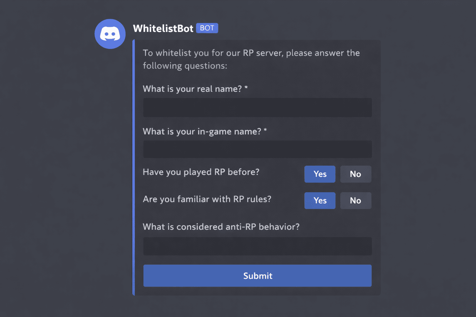 Responda para provar que entende as bases do roleplay e as regras do servidor.