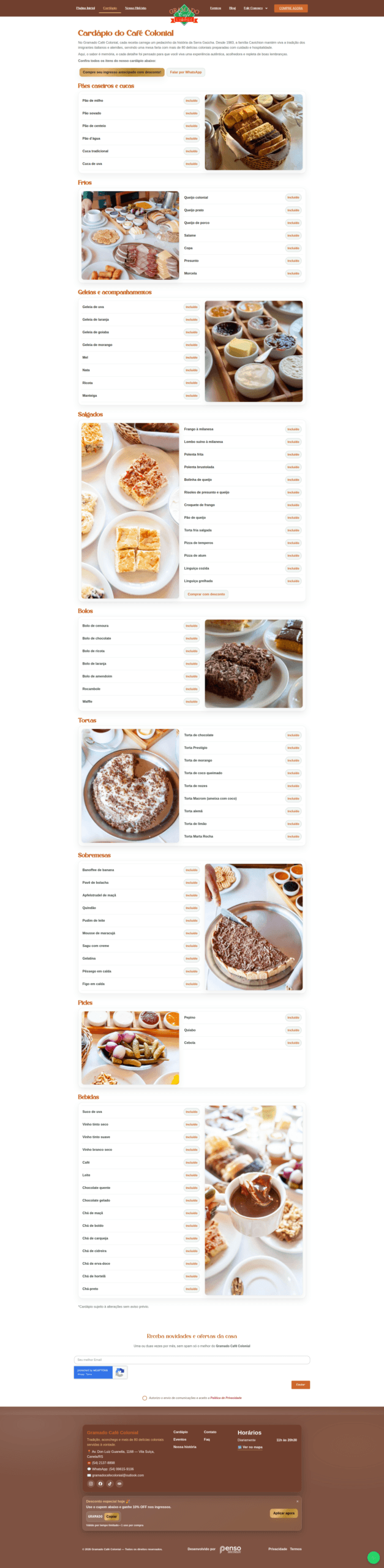 Cada página foi desenhada para conduzir o visitante de forma natural até a principal ação: garantir sua experiência de café colonial com antecedência e desconto.