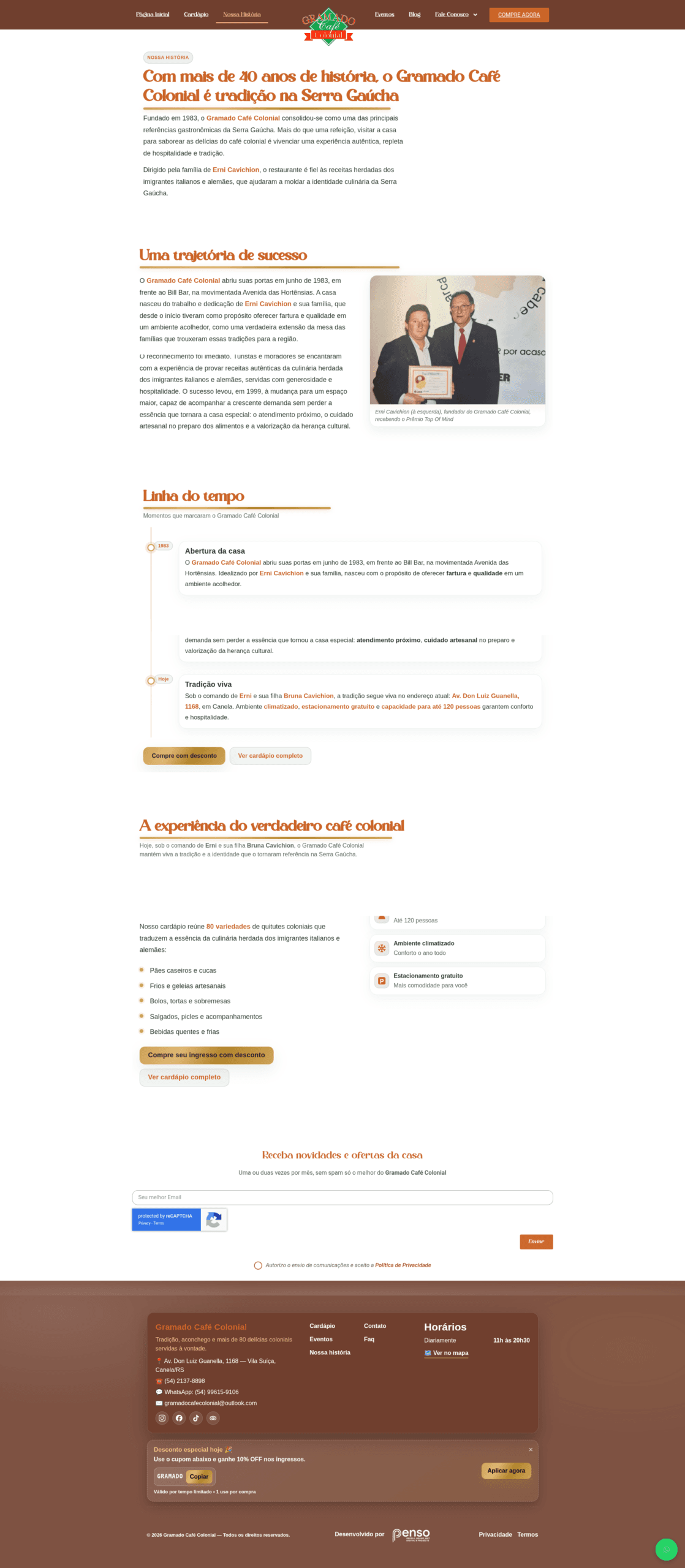 Fundado em 1983, o restaurante é reconhecido por oferecer uma experiência autêntica de café colonial, com mais de 80 delícias servidas à vontade, preservando receitas e costumes herdados dos imigrantes italianos e alemães. O desafio foi traduzir toda essa tradição, hospitalidade e fartura em uma plataforma digital moderna, funcional e orientada à conversão.
