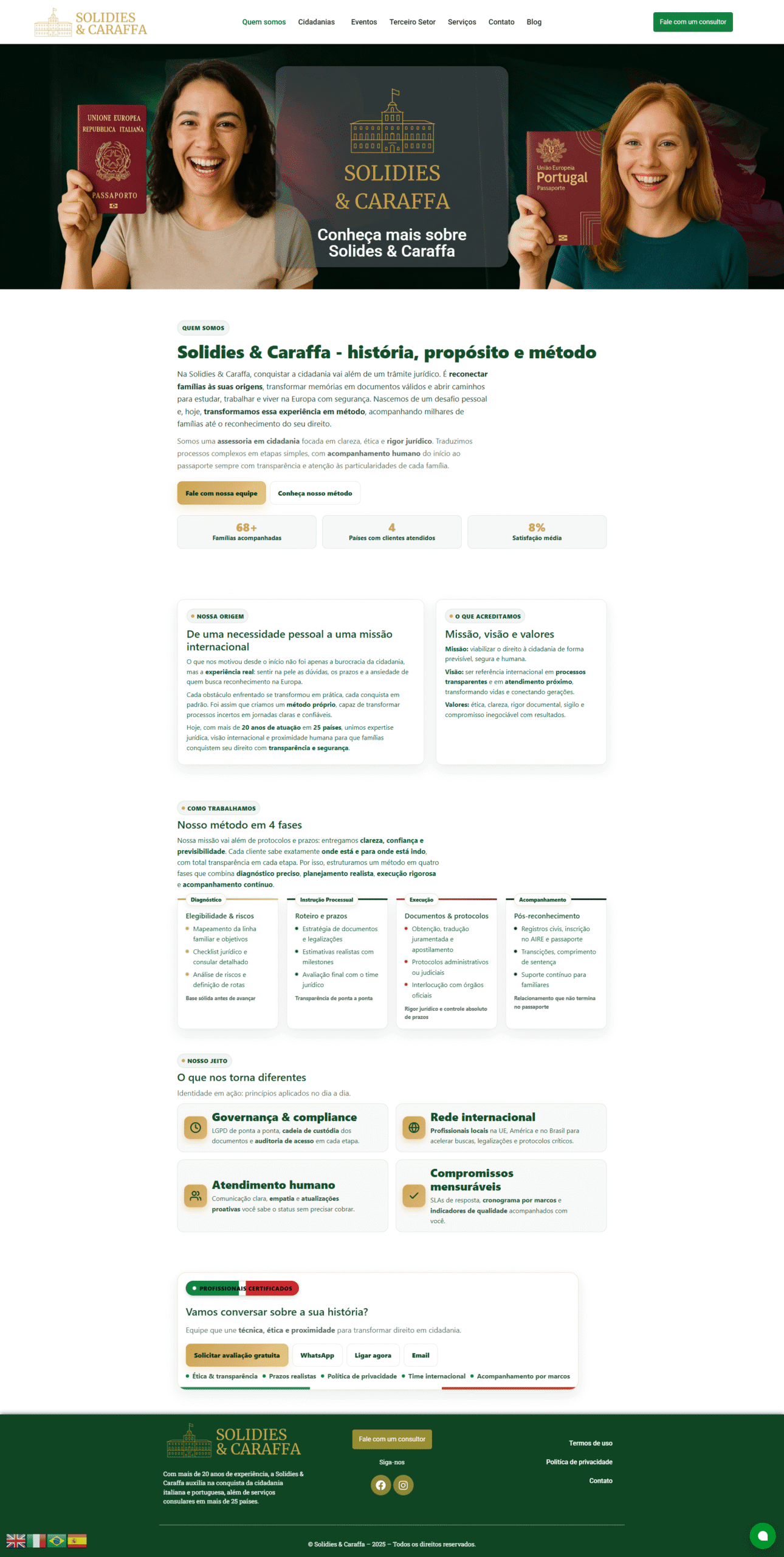 Temos orgulho em apresentar um dos projetos mais elegantes e completos desenvolvidos pela Forcoder 360°: o novo site institucional da Solidies & Caraffa, empresa com mais de 20 anos de experiência internacional em cidadania italiana, portuguesa e serviços consulares.